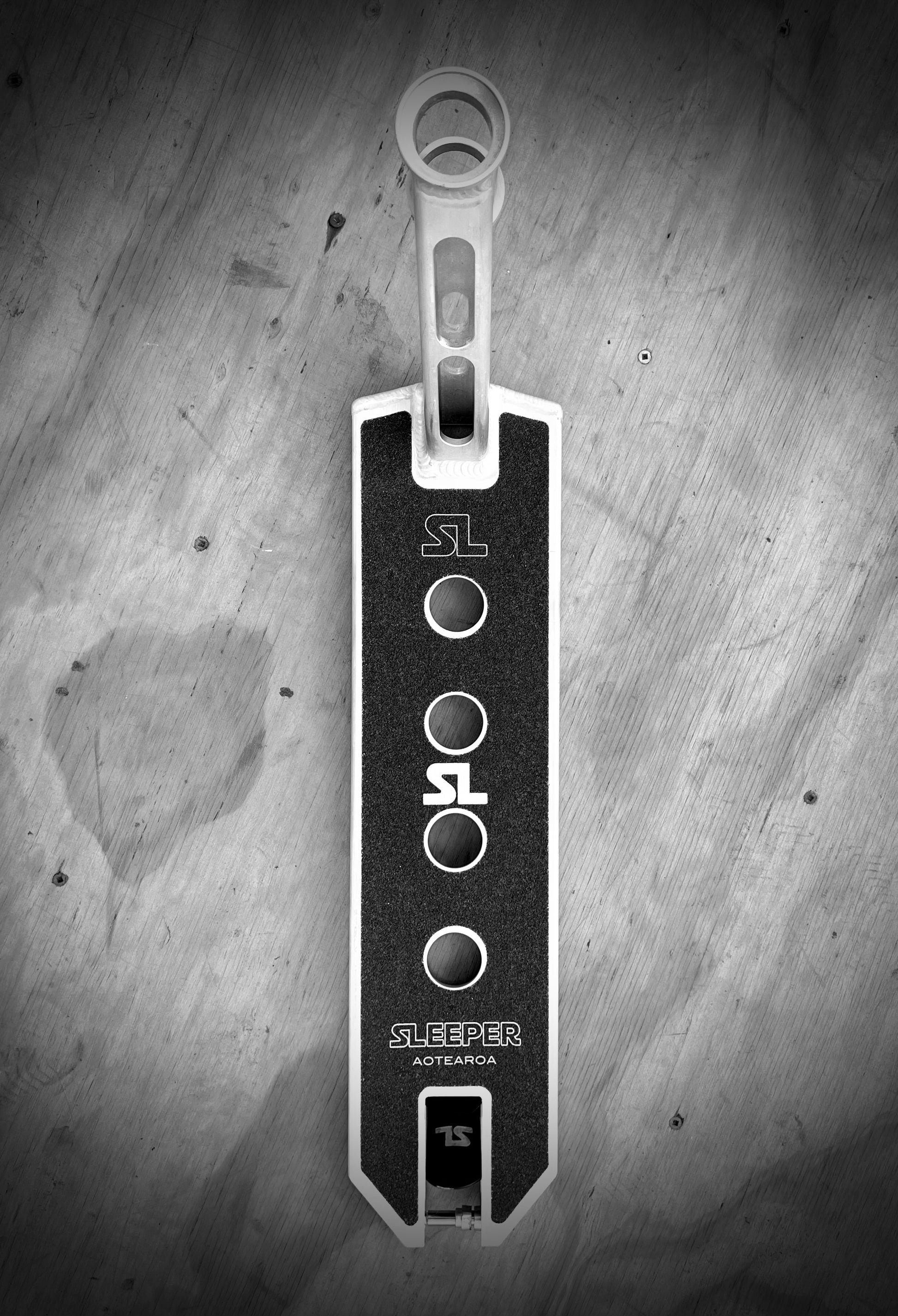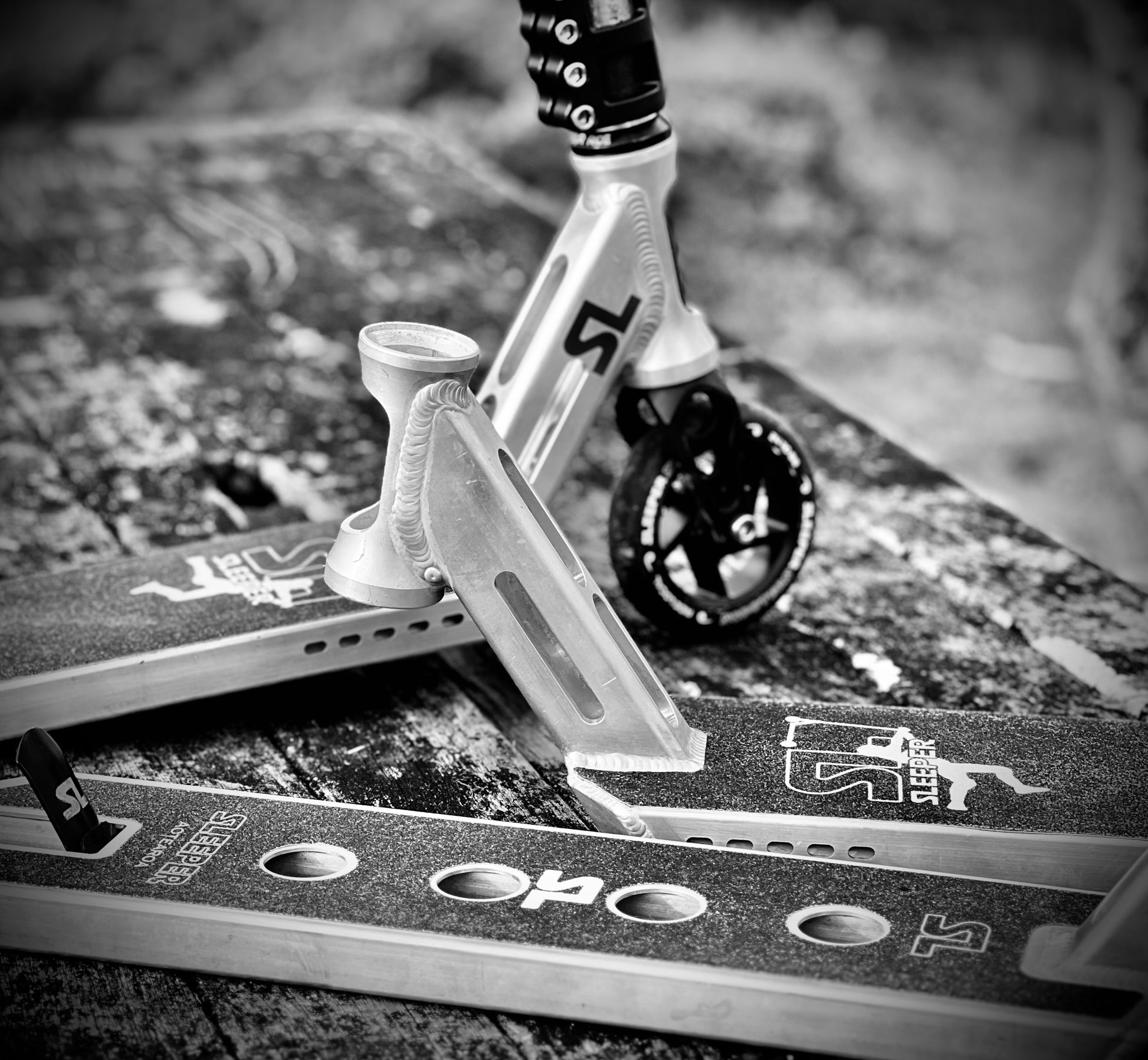 Light scooters are what every rider wants so designing light parts that don't break on their first session at the park was the key design aspect when developing the very first Sleeper Complete. Multiple demos and months of test riding went into the design process of the Sleeper Holey Moley. The Sleeper Holey Moley is an 'ultra light' deck with the 17.3" weighing in at only 1.06 kg and the heaviest 19.5" only 1.18kg - this is with the brake and axle fitted (some other brands weights are misleading as they are weighed without the brake or axle). It's not all about weight though, balance point, foot space, head angle and blunt space are also critical parts of any decks design. The Sleeper Holey Moley deck has more foot room than any other deck and is beautifully balanced, allowing the rider to master tricks faster enabling the fastest skill progression possible. They also have a premium anodised alloy finish giving a clean aesthetic with striking colour options.